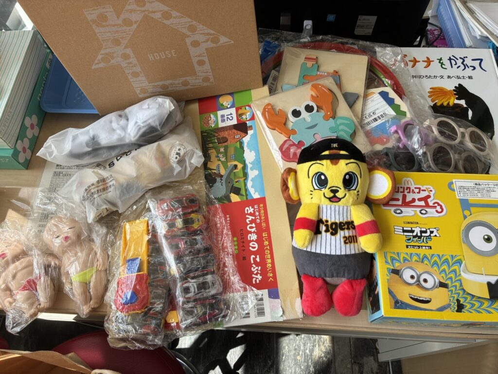 阪神タイガースのマスコット人形、ミニオンズのおもちゃ、パズル、絵本、ぬいぐるみなど、お子さまの成長とともに集まってきたであろう品々です。
