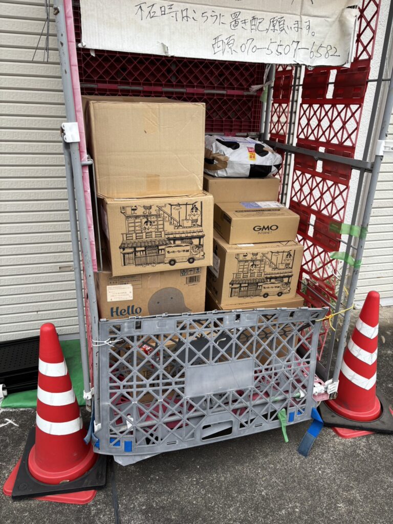 営業所の入口には、お客様が直接お持ち込みくださった段ボール箱が積まれていました。
