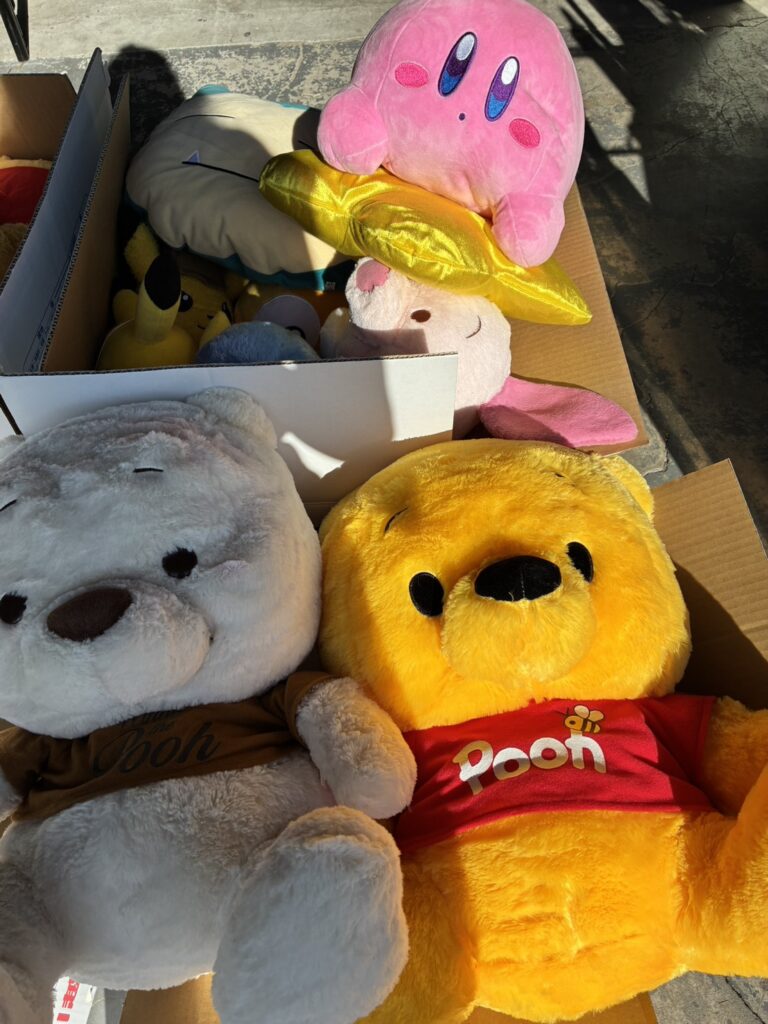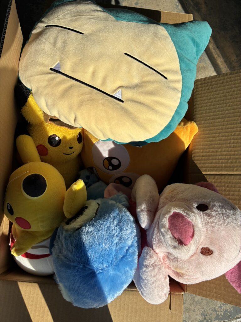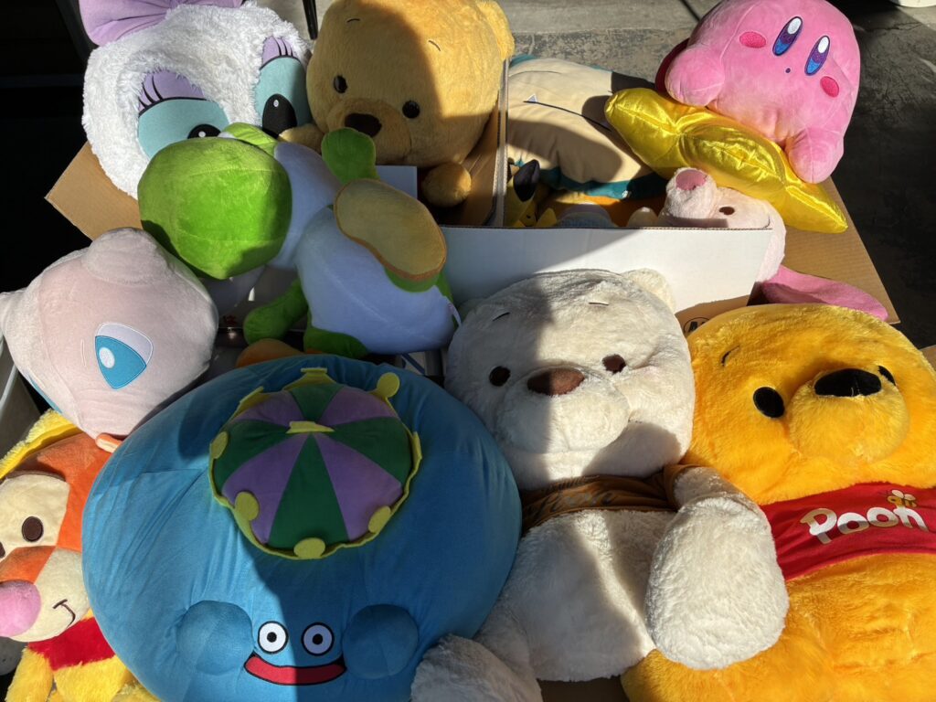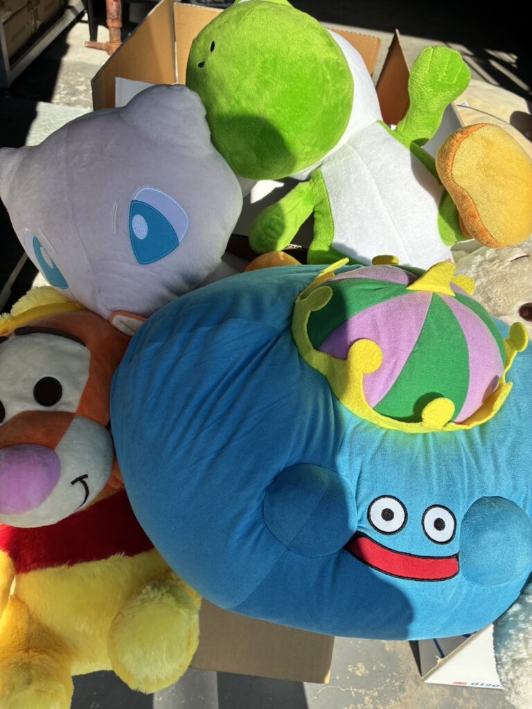 ドラゴンクエストのスライム、ポケモン、その他人気キャラクターのぬいぐるみが複数届きました。鮮やかな色のぬいぐるみは、子どもたちの心を明るくする素敵な贈り物です。