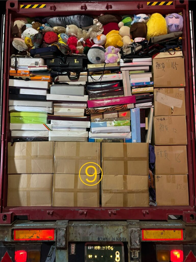 コンテナの上部を見ると、カラフルなぬいぐるみがたくさん積まれています。今回のコンテナ詰め込みで特に印象的だったのが、ぬいぐるみの圧倒的な量です。