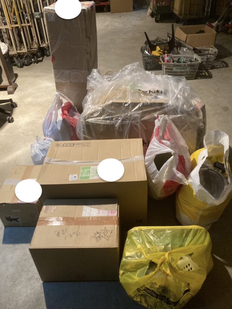 ダンボール箱、ビニール袋、黄色いゴミ袋と、梱包方法も様々。宅配で届いたもの、営業所前の宅配ボックスに置いていってくださったものと、寄付のスタイルも多様です。