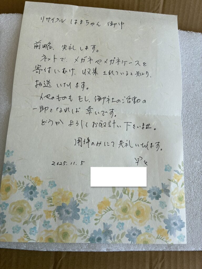 花柄の便せんに綴られたのは、「ネットでメガネやメガネケースを寄付に気付、収集されている事を知り」という一文。インターネットで当社の活動を知り、寄付を決めてくださったとのことです。