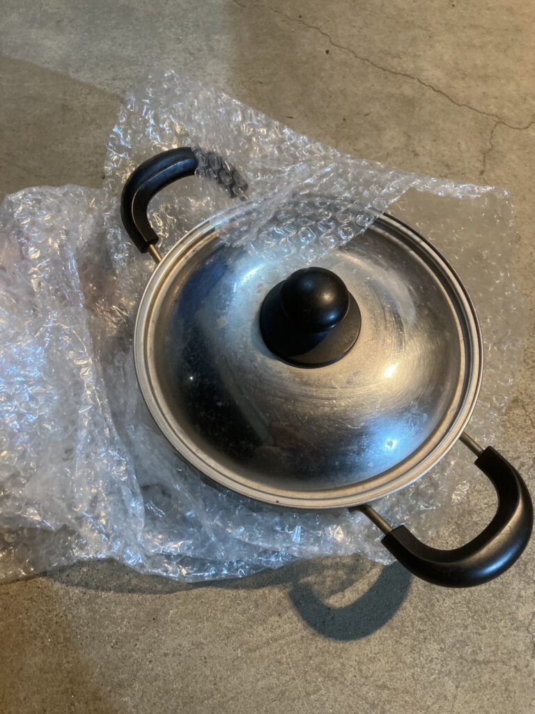 エアキャップで丁寧に包まれているのは、ステンレス製の両手鍋。