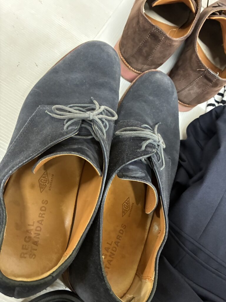 REGALの上質なスエード靴、フォーマルな黒革靴、きちんとしたスラックス、シンプルなシャツ類。