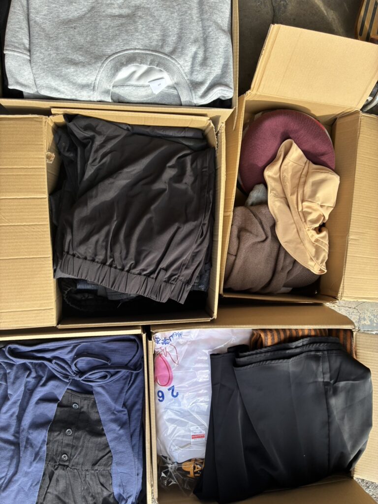 段ボール箱11箱分、たくさんの衣類とバッグ。