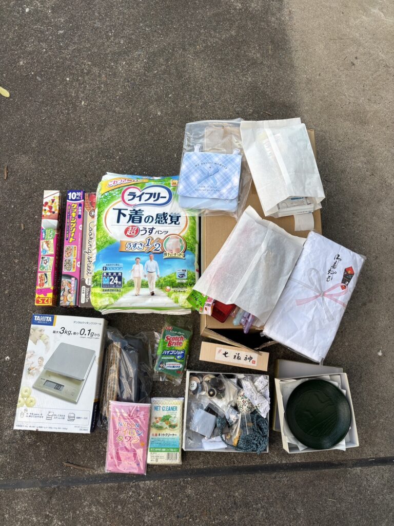 鉛筆、デジタルスケール、掃除用品、介護用パンツ、食器、タオル。
