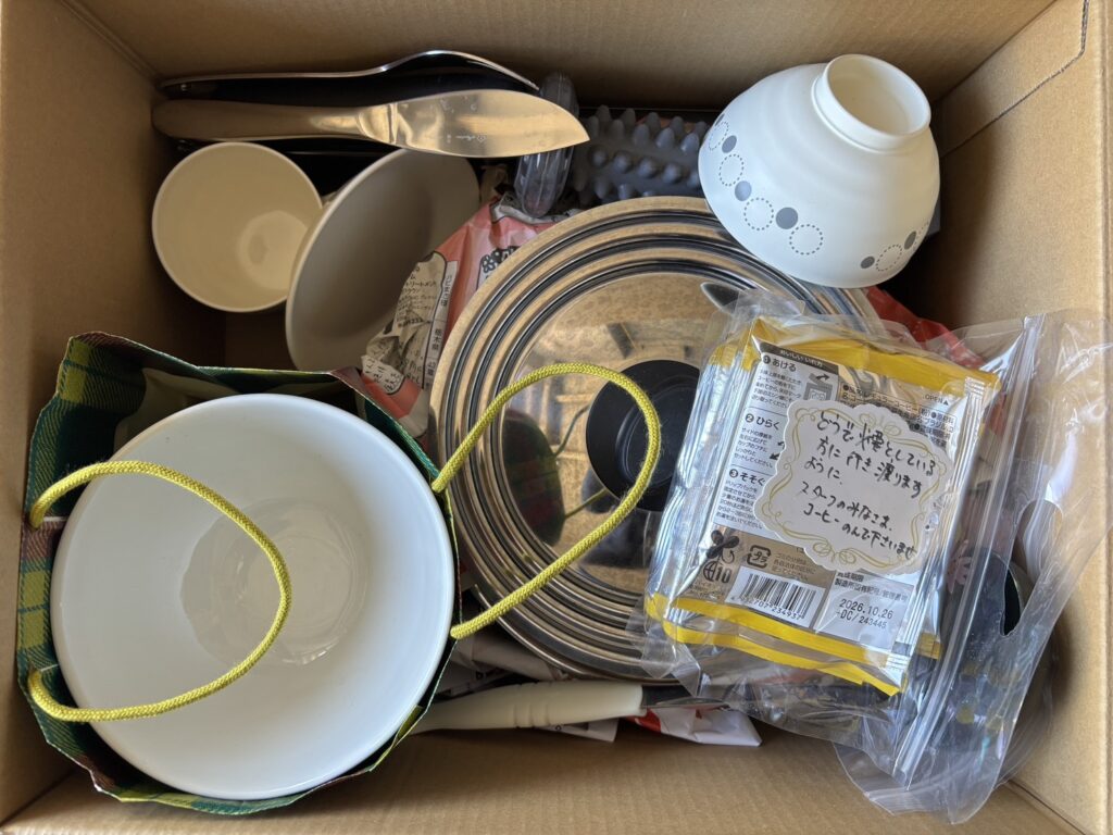 千葉営業所に、食器やキッチン用品の宅配寄付が届きました。