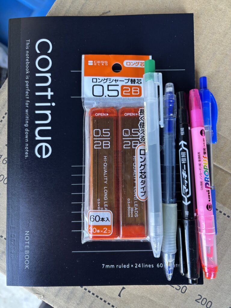 今回、千葉営業所に届いた宅配寄付で、ノート、シャープペンシルの替芯、各種ペンなど、学習や仕事に必要な文房具をご寄付いただきました。ノートと筆記用具がセットで揃っており、すぐに使い始めることができます。