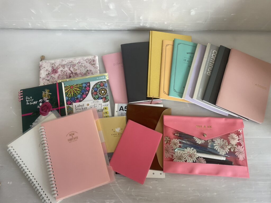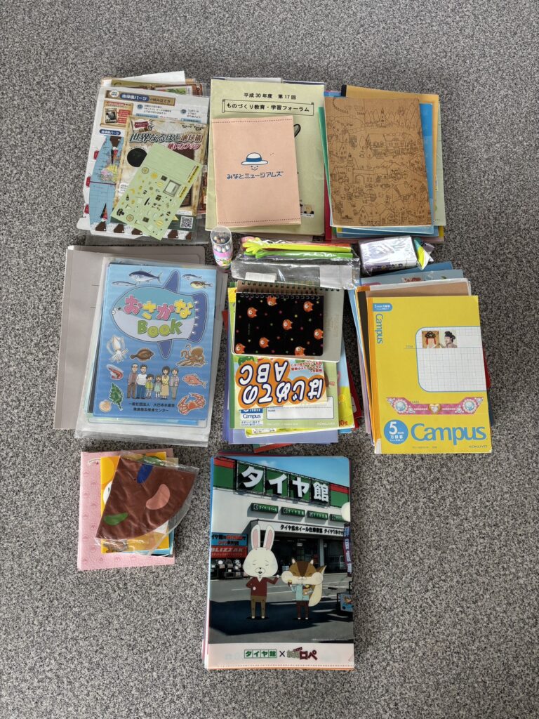 様々なノートをご寄付いただきました。Campusノート、おさかなBook、学習教材のノート、カレンダー、ファイル類など、学習に役立つ品物が揃っています。