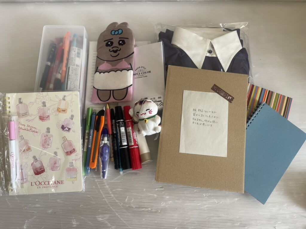 ノート、ペン類、色鉛筆などを新品の洋服とともにご寄付いただきました。招き猫のぬいぐるみマスコットも添えられており、心温まる寄付です。