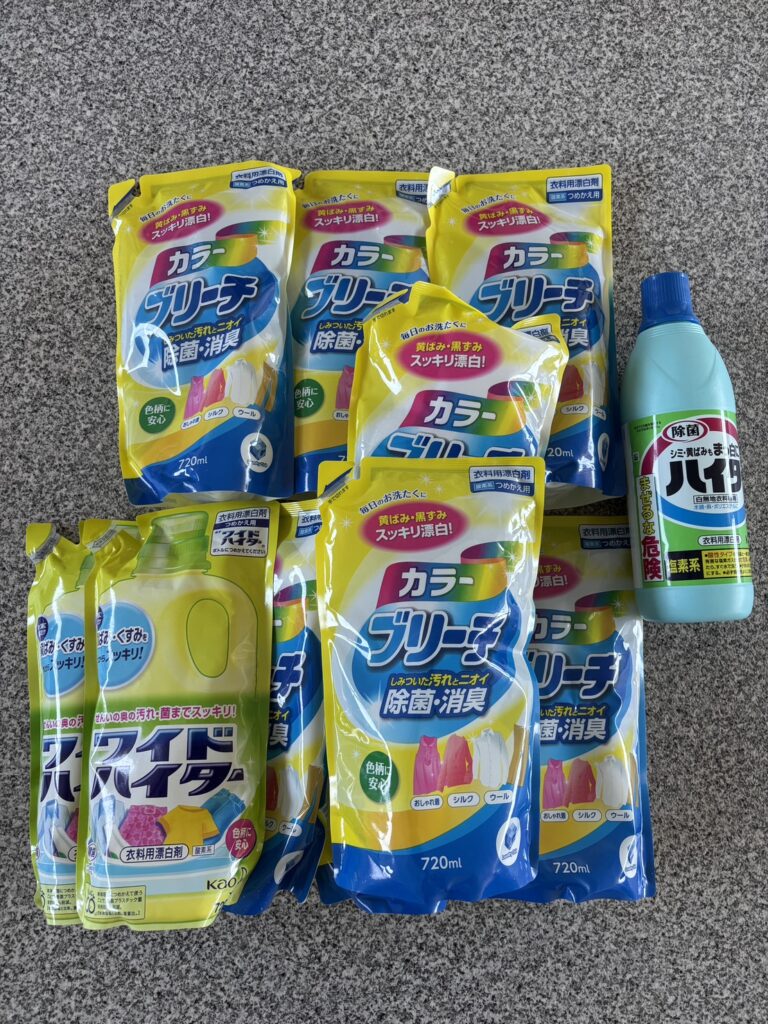 カラーブリーチの詰め替えパック(複数)、ワイドハイターの詰め替えパック、ハイターのボトルなど、洗濯用洗剤をたくさんご寄付いただきました。