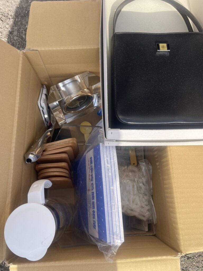 クリスタル台座の置き時計、木製コースターセット、保存容器など、生活雑貨がまとめて届きました。