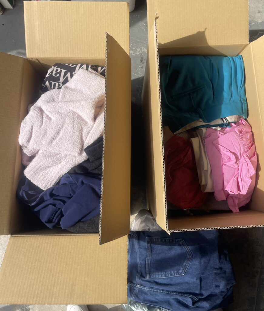 トップス・パンツ・デニムなど、さまざまな色・素材の衣類が段ボール2箱にまとめてお持ち込みいただきました。