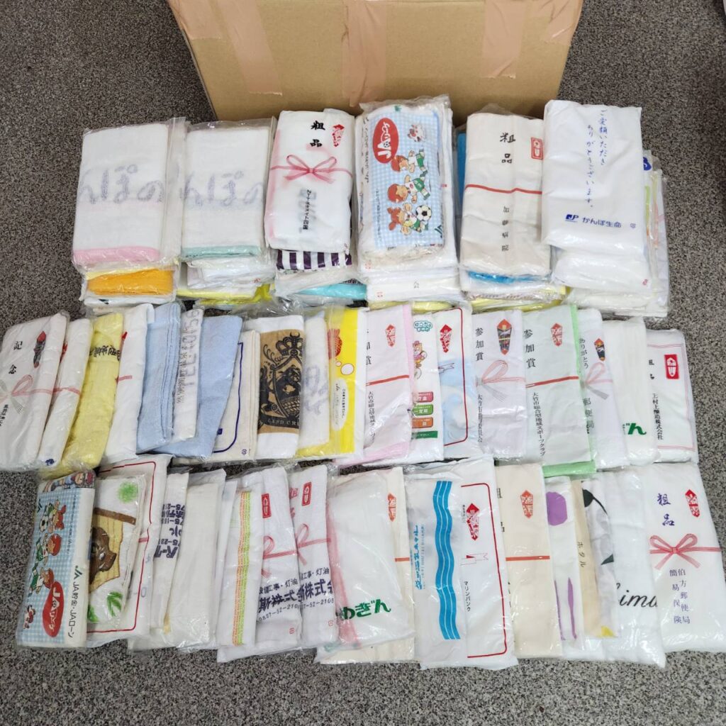 銀行や保険会社からいただいたものや、スポーツ大会の参加賞など、粗品としてもらったタオルを集めてお送りいただいたものです。