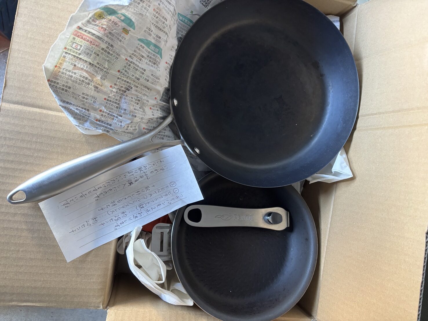 ブラックのフライパンが大・小2本、段ボールに入った状態でお送りいただきました。
