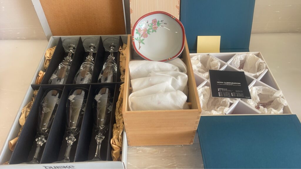 続いて、クリスタルガラスのワイングラスセット(化粧箱入り)、花柄の深皿セット(木箱入り)、クリスタルグラスセット(化粧箱入り)など、贈答品として保管されていたと思われる未使用に近い食器類もお持ちいただきました。
