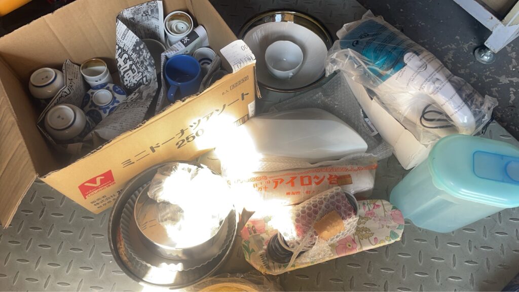 まず、湯呑み・マグカップ・お皿・ボウルなど、日常使いの食器類がひと箱分届きました。アイロン台や容器類も一緒に入っており、キッチン周りの日用品をまとめてお持ちいただいた様子でした。