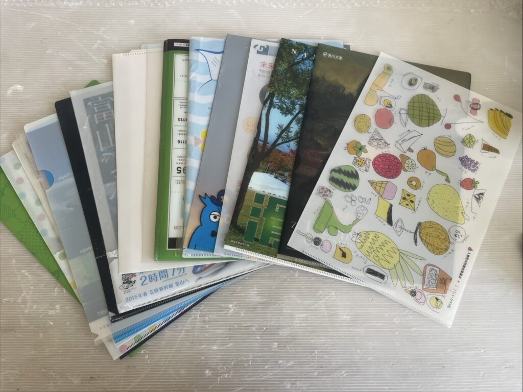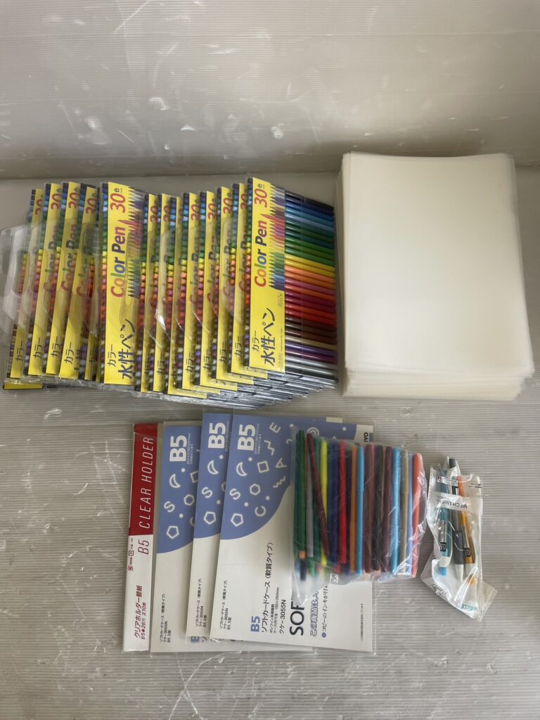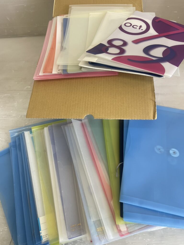 ファイル類はクリアファイル(無地・デザイン柄)、B5ソフトカードケース、クリアホルダー、リングファイルなどが段ボールいっぱいに届きました。