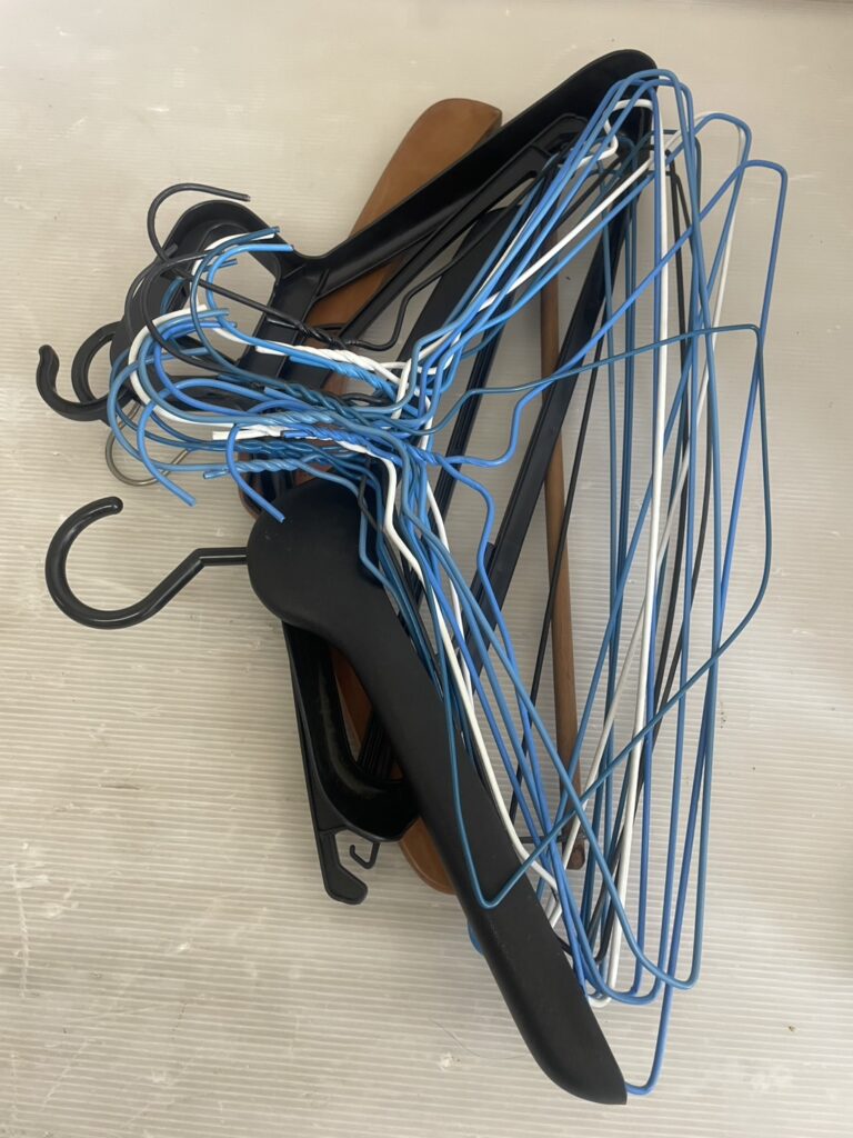 また、プラスチック製・ワイヤー製・木製のハンガーがまとめて届いています。