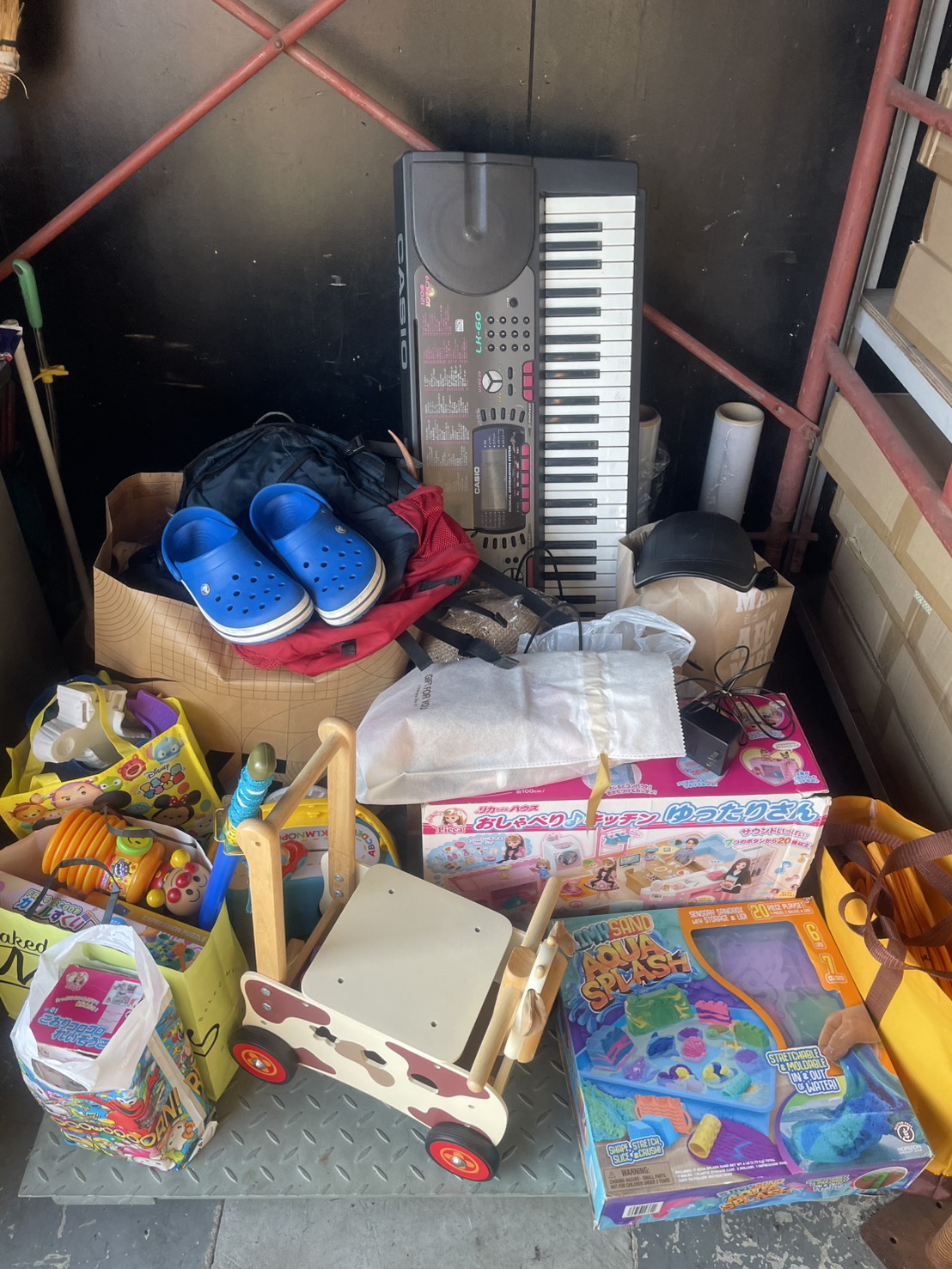 大阪営業所に、おもちゃや楽器の持ち込み寄付をいただきました。 キーボード(電子楽器)、クロックス、子