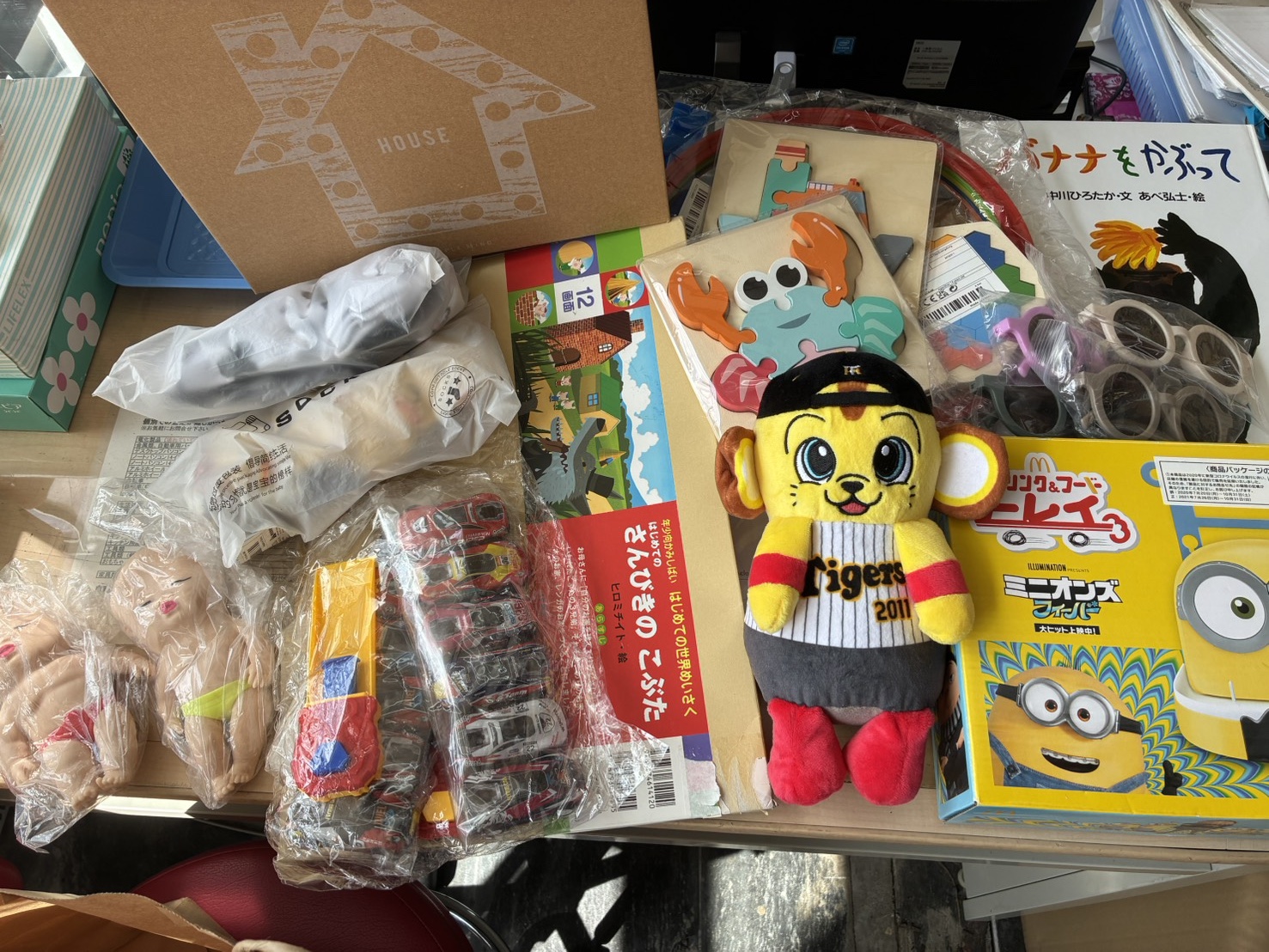 大阪・枚方の拠点に、たくさんのおもちゃを直接お持ち込みいただきました。 段ボール箱いっぱいに詰められ