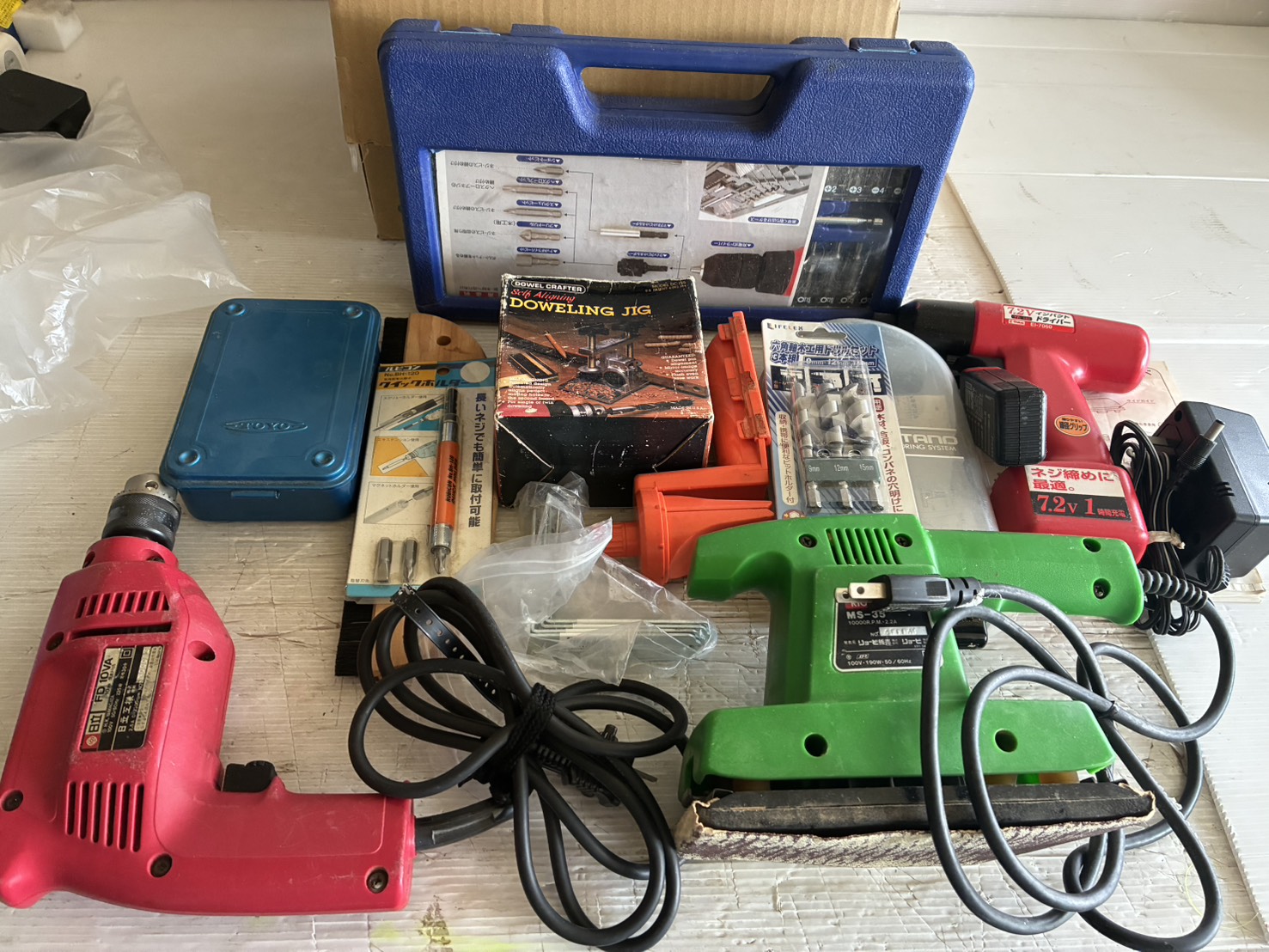 段ボール箱いっぱいに詰められた、様々な電動工具とDIY用品。 今回、使わなくなった工具一式を寄付して