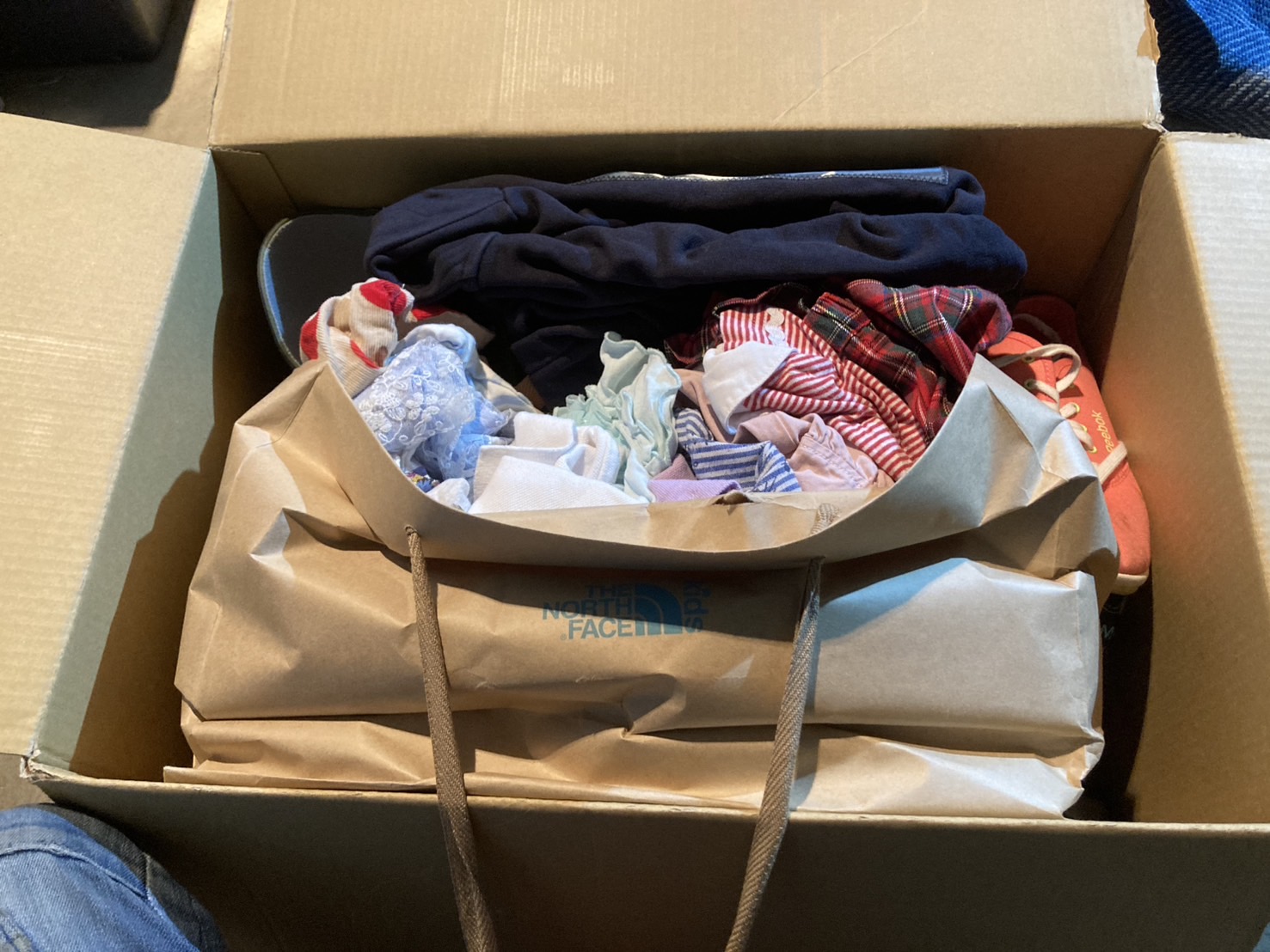 千葉営業所に、衣類と靴の宅配寄付が届きました。 ダンボール箱を開けると、大人用の衣類、カラフルな子供