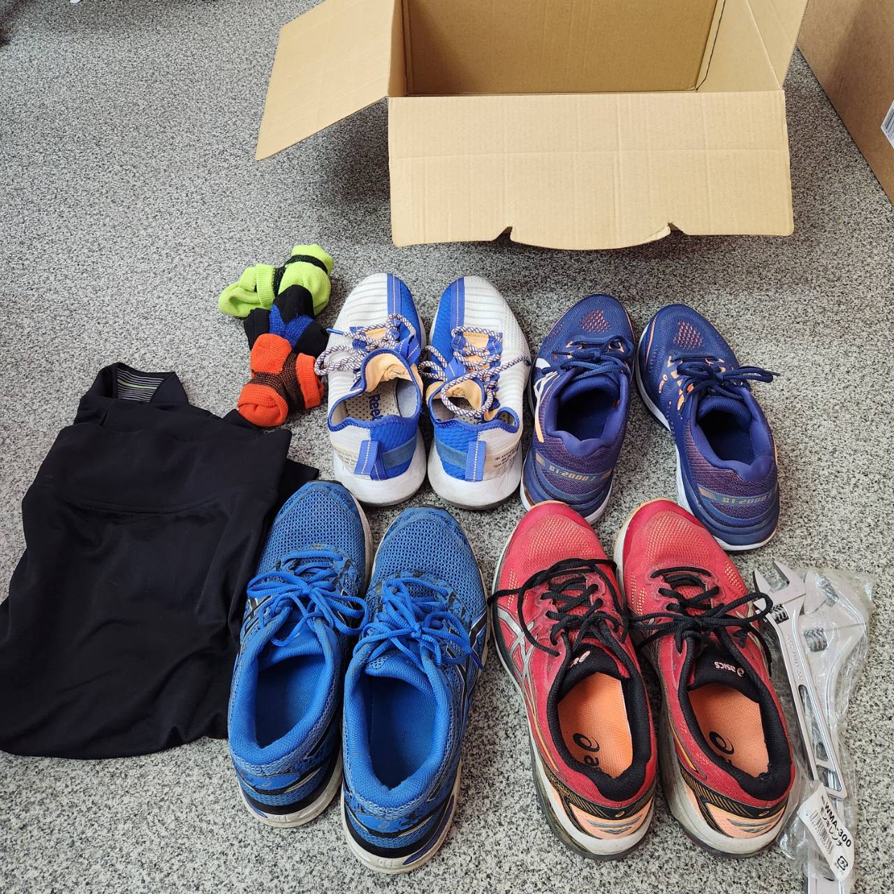 岡山営業所に、スポーツシューズ・ウェア・ソックスの宅配寄付が届きました。 段ボール箱に詰められた、様