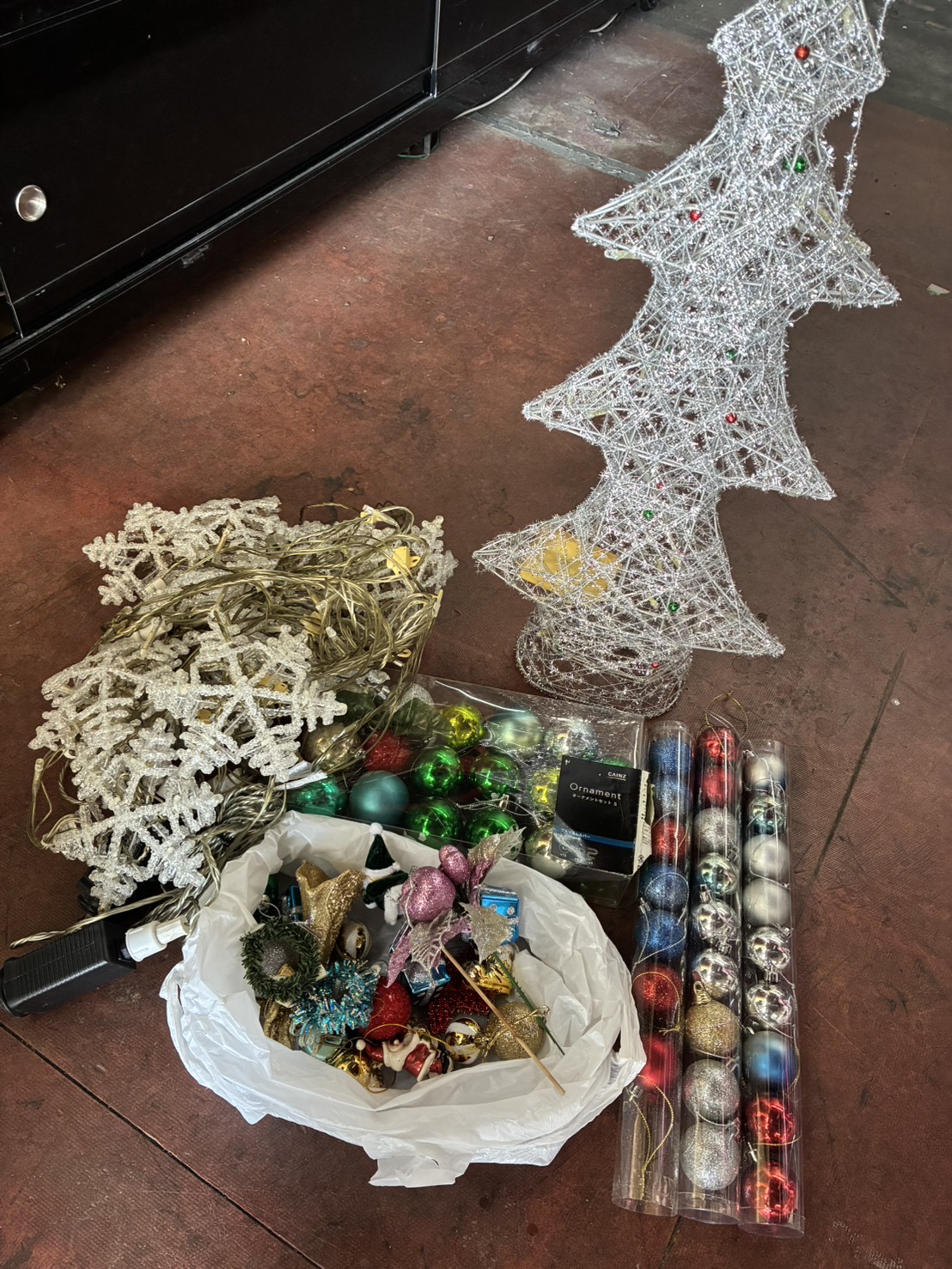 大阪営業所に、クリスマスツリー・オーナメント・飾りの宅配寄付が届きました。 様々なクリスマス装飾品。