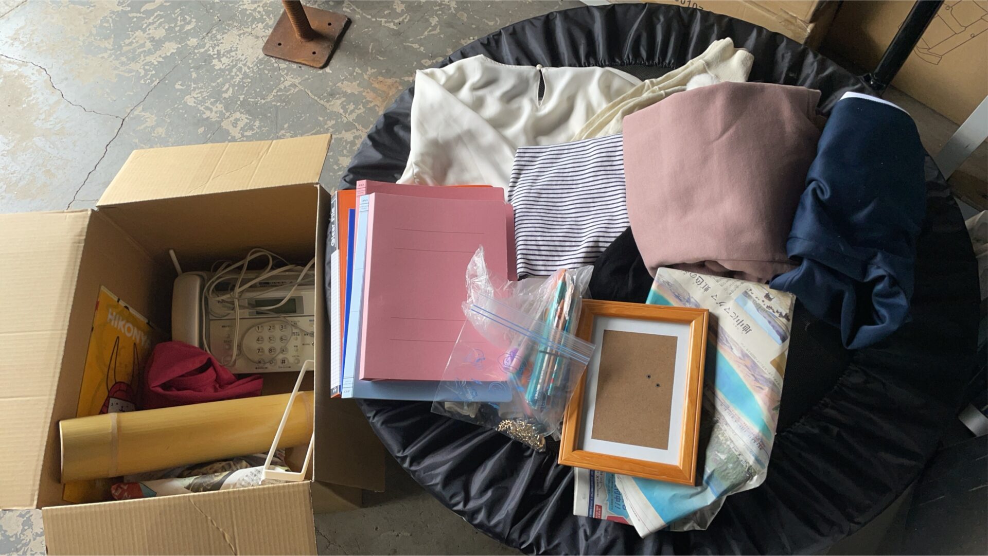 大阪営業所に、インテリア・文房具・電話機など多様な品物の宅配寄付が届きました。 黒い大きな袋とダンボ
