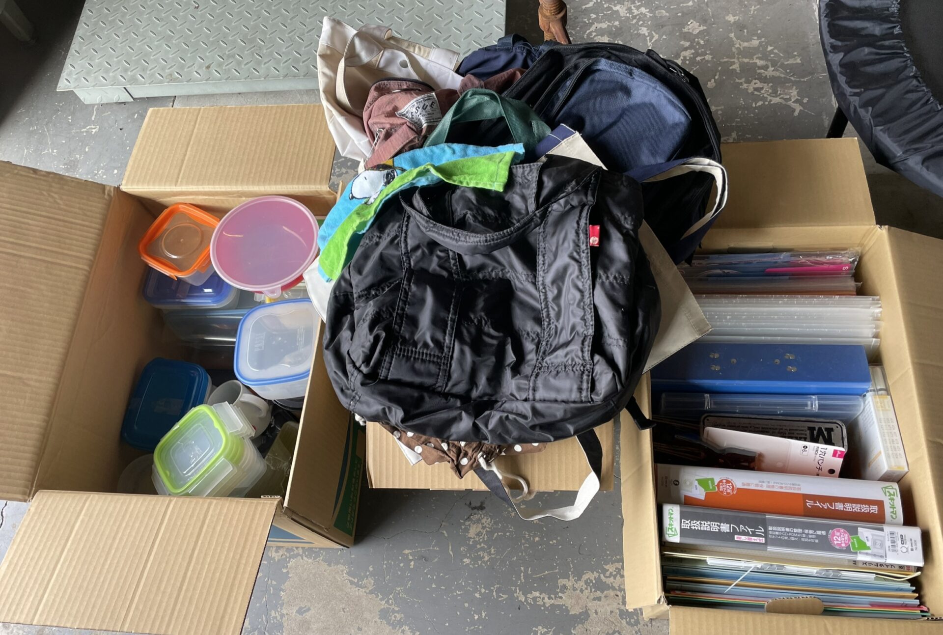 大阪営業所に、リュック・保存容器・ノート類の宅配寄付が届きました。 複数のダンボール箱に詰められた、
